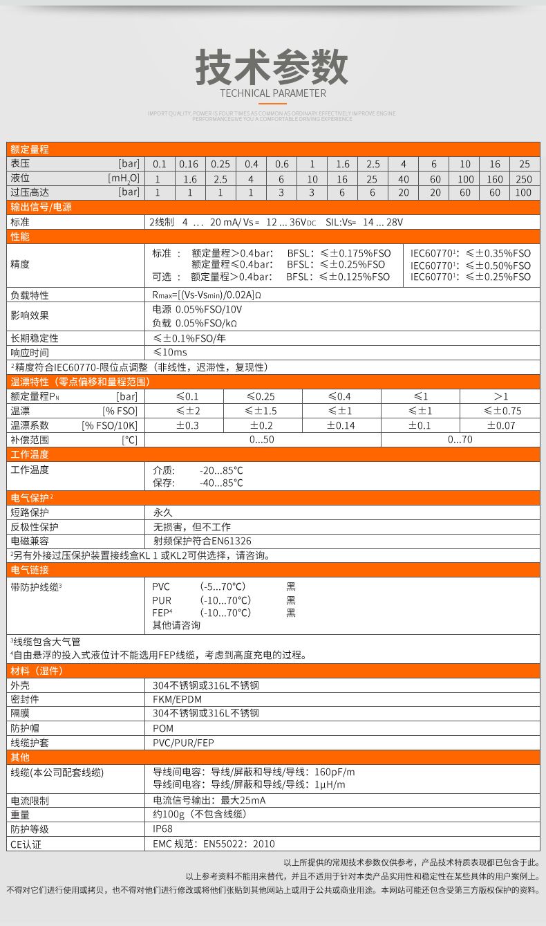 温度漂移 ≤±0.05%FS/℃(温度范围-20~85℃,包括零点和量程的温度影响)